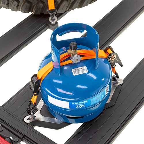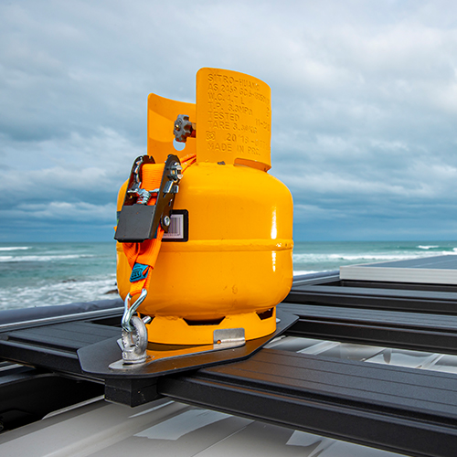 Een gasfles veilig bewaren is een must tijdens het reizen. Uw gasfles bevestigen en verwijderen is een fluitje van een cent met de gasfleshouder. Hij is perfect voor het vervoeren van een gasfles tot 9 kg, wordt compleet geleverd met de basis, ratelband en twee bevestigingsoogbouten en kan worden bevestigd aan een individuele draagbalk of tussen draagbalken.