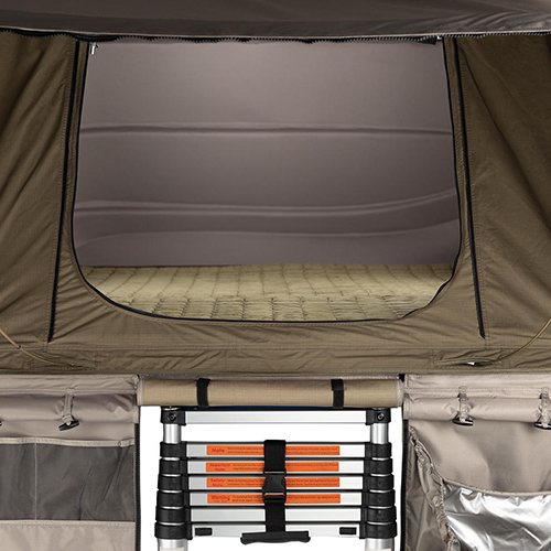 De tent is snel en moeiteloos op te zetten en in te pakken. Met functies als een interne telescopische ladder, opening met gasveer en slechts 3 ratelbanden met drukvergrendeling wordt reizen een fluitje van een cent.