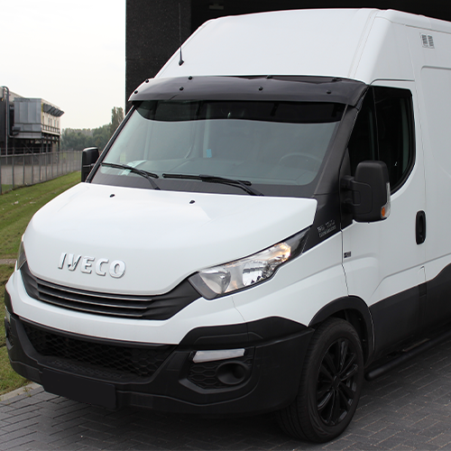 Our sun visors are made of acrylic. It is transparent and has a smoke color (anthracite). With this, the sun visor blocks the sun but does not block your vision. The shape of the sun visor is designed to reduce wind noise. It curves with the windscreen and therefore follows the lines of your Iveco Daily. The acrylic is easy to clean with a glass cleaner.