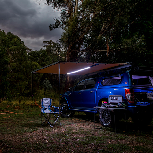 De ARB zwarte aluminium luifel met verlichting 3000x2500mm. Met de styling van de nieuwe 4X4's op de markt, is ARB aan de slag gegaan om een opvallende luifel te maken die boven de concurrentie uitsteekt, met een glanzend zwarte gepoedercoate aluminium behuizing en alle functies waar ARB luifels bekend om staan plus meer.