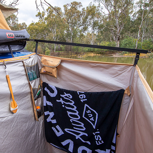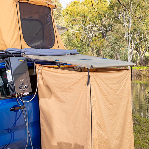 Eenvoudig op te zetten en te bedienen. Ontworpen voor gebruik op de achterkant van dakdragers of zijkant van kleinere SUV's en netjes op te bergen in een stevige PVC tas.