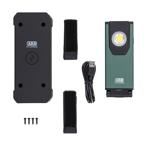 Persoonlijke verlichting met de ARB Horizon werklamp omvat een draadloze oplader en is ook compatibel met alle QI-gecertificeerde draadloze slimme apparaten (de meeste draadloos opgeladen apparaten). Draadloos opladen voor de ARB Horizon werklamp maakt opladen zo eenvoudig als het plaatsen van de werklamp op de oplaadbasis en het automatisch laten opladen tot de volledige staat, geen kabels meer inpluggen of zoeken naar de kabel. De draadloze oplaadbasis heeft zeldzame aardmagneten ingebouwd om de werklamp automatisch in het juiste oplaadgebied te plaatsen en om hem op alle goede metalen oppervlakken te laten kleven. Er worden ook bandjes meegeleverd om de lamp indien nodig op zijn plaats te houden op gladde wegen. (Alleen geschikt voor draadloos opladen voor ARB Horizon-werklamp